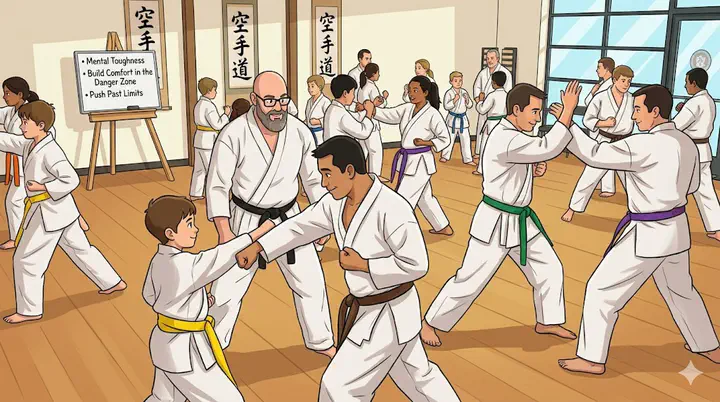 Last night we dialed up the pressure on our sparring drills. We’re still not quite to “free” sparring. We’re doing what I’d call high-intensity, one-step, pre-arranged sparring, and we had to talk a bit about mental “toughness.” In karate, we can’t just train to be physically tough. We also have to cultivate the mental toughness necessary to use our physical skills, and keep using them even when the going gets tough.